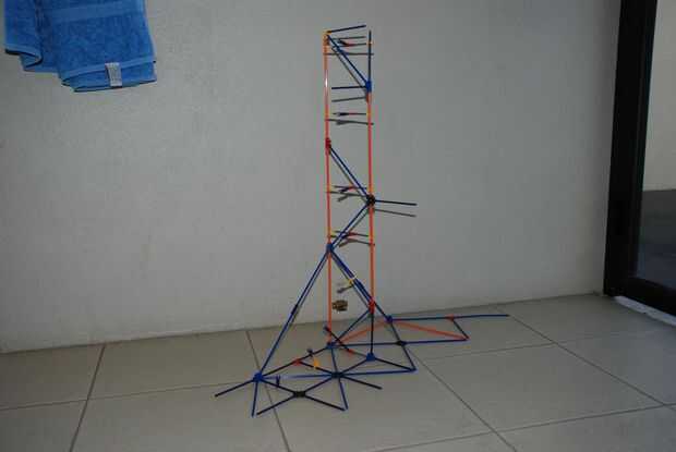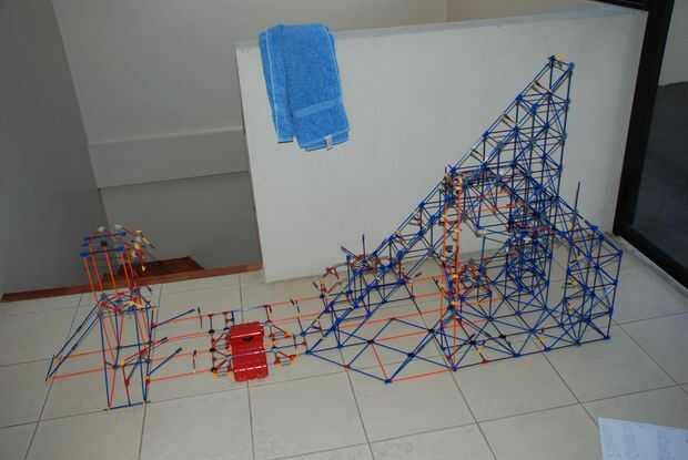 3,5 ft vertical montaña rusa creada a partir de K'Nex. El tiempo de construcción fue alrededor de 3 horas. Esta montaña rusa es un diseño totalmente original.