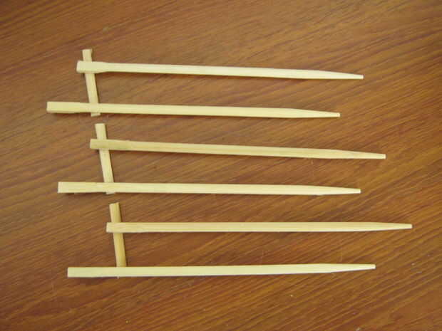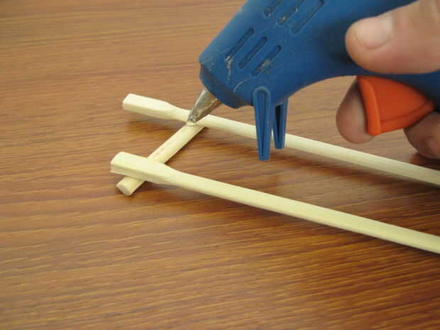 usar la pistola de pegamento caliente y unirse a dos palillos sobre los palos de 2" dejar a uno por encima de la línea, esto le dará un ángulo de a ferrocarril de la montaña rusa ¿(de amor)?
