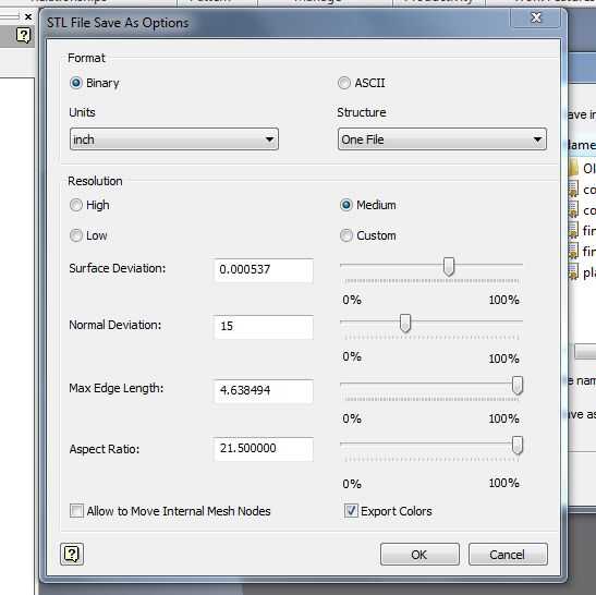 Ahora, una vez guardado, exportación de ensamblado en formato CAD. Cuando aparezca la siguiente ventana, presione opciones y asegúrese de que su medición se establece en pulgadas y no centímetros, este se encuentra en la esquina superior izquierda de la ventana. A continuación abra el archivo de CAD en archivos de catalizador y comenzar la impresión 3D. Después se realiza la impresión, repita la exportación y SAD procesarán e impresión la montaña.