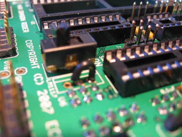 - Hay un regulador secundario incluido en el kit de piezas avanzadas en caso de alimentación del jinete con el dragón del AVR, pero desea el circuito para funcionar de 3,3 voltios. Quiero mis circuitos funcionando a 5 voltios por lo que en su lugar sólo usé una pequeña longitud de cable para conectar los pines 1 y 2 de U6 juntos. Ver la foto de abajo. Usé un pequeño U de alambre por lo que sería muy fácil de quitar en un momento posterior si desea.