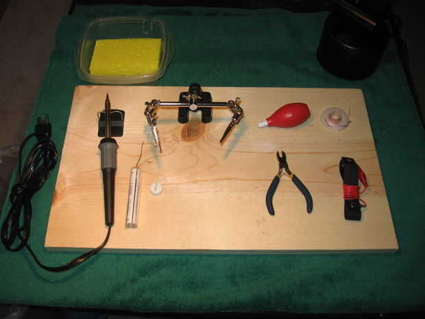 Porque necesitamos soldar algunos encabezados de pin en el dragón de AVR sensible creo necesario usar un soldador conectado a tierra. Para tomar más precauciones yo usando una muñequera antiestática mientras se suelda también. Un hierro de 15 vatios no consigue muy caliente y esto debería ayudar a asegurar un proceso de soldado "suave" para nuestros componentes. Me gustaria tener herramientas para desoldar por lado en caso de que cometo un error. Planificación adelante se ahorrarle tiempo y ayudar a minimizar el daño causado por errores.