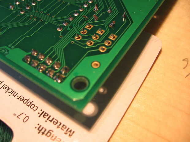 Para cabezales de soldadura utilizar una técnica especial. Pone los encabezados de pin en su posición y luego poner un trozo de cartón encima de ellos. Conservo mi pulgar en la tarjeta para mantener los encabezados de pin en lugar mientras que voltea el tablero. Una vez que la Junta está descansando en las cabeceras de pin que Deslice la tarjeta hacia fuera. Luego de soldadura sólo uno de los pines de cada encabezado. Esto mantienen en su lugar y le permiten volver a voltear el tablero y compruebe que los encabezados están al ras con el tablero y los pernos verticales. Si no, simplemente ponga su dedo en uno de los pasadores en la cabecera del pin, calentar la Junta del solador y sostenga la plomada de la cabecera y hasta que se endurece la soldadura. Tenga cuidado de no poner el dedo en el pasador soldado en lugar o que se queme esto!
