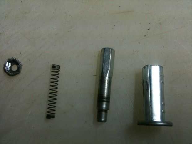 El barril de la pivote de la puerta es hexagonal y una tuerca de 3/16 de pulgada encaja justo en el extremo cortado para que plata soldadura uno para el cañón acortado. PERO antes de hacerlo tienes que cortar y perforar el pin.