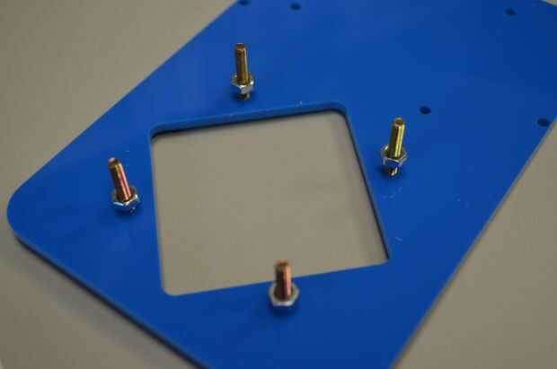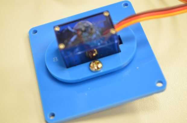 舵機需要由圓形的舵機固定架 (a) 與8mm螺絲將其固定在底座上 圓形舵機固定架共有 a、b、c 及備品共四個。 固定好的底座與底座舵機如圖4。