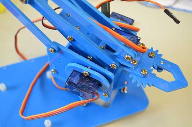 將左右夾具套件略開 (如圖七), 再將夾具連桿固定於夾具上, 另一端請小心依齒輪與齒孔位置固定好, 完成後如圖八, 夾具可以正常開合為止。 再將整合組裝好的手臂夾具安裝置手臂支桿上, 完成手臂套件安裝 (如圖九).