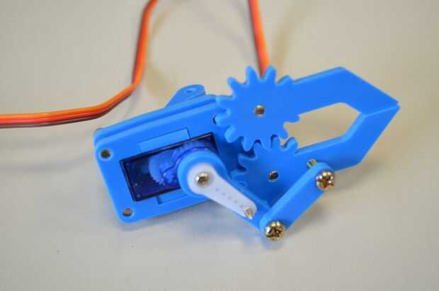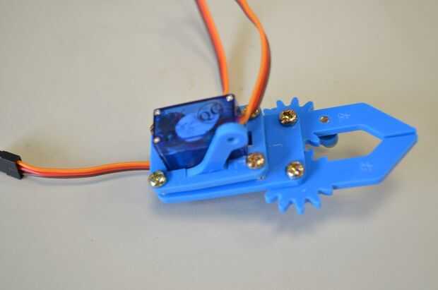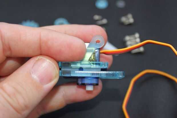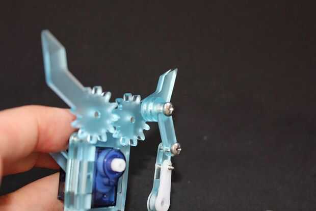 固定好夾具舵機後, 在安裝左右夾具 (套件上方有註明位置), 同時確定夾具的舵機齒輪依順時鐘方向旋轉至底。