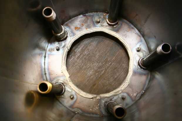 -Oriente la boquilla para que apunte entre dos boquillas adyacentes. Una vez todo instalado, hacen un cinco estrellas a un lado, todos hacia el centro de la abertura de la campana de reducción.