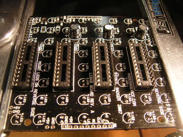 Colocar los zócalos IC de la placa y soldar dos cables. Compruebe la posición de las tomas. Las muescas de los sockets deben mirar los condensadores.