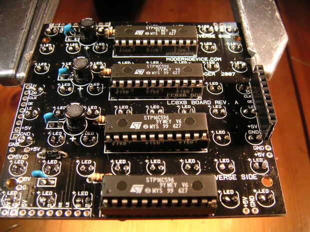 Son capaces de poder un solo tablero de 8 x 8 a través de la BBB. Si desea encadenar juntas, te sugiero leer las instrucciones (ADVERTENCIA de PDF) de la Junta. Usted debe asegurarse de elegir la fuente de alimentación correcta para su proyecto. Puedo atestiguar el hecho de un poder estadístico suficiente matriz mostrará un comportamiento muy errático. Se puede observar un puente de alambre en el BBB en los cuadros en las instrucciones de la Junta. Ignorar el puente a menos que tenga una mayor Reverendo C BBB.