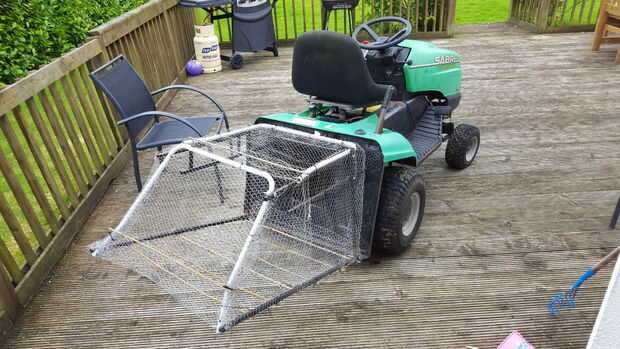 1. empecé tirando la silla aparte y notó que las piernas redondeadas encajaría perfectamente en el mecanismo de sujeción en la parte posterior de la podadora para sostener la caja original de la hierba.