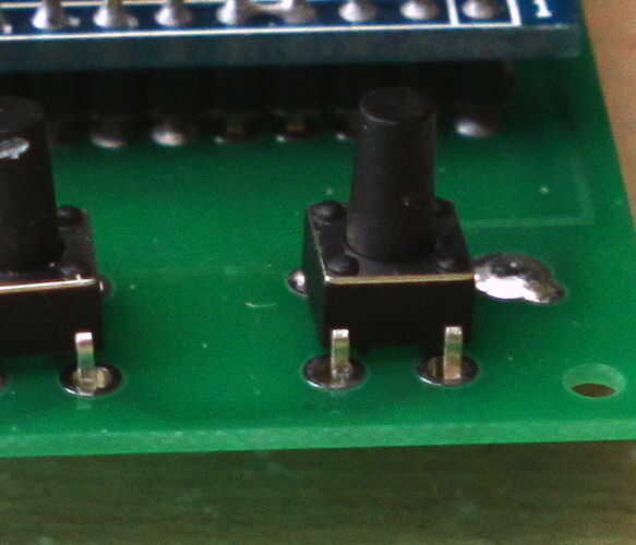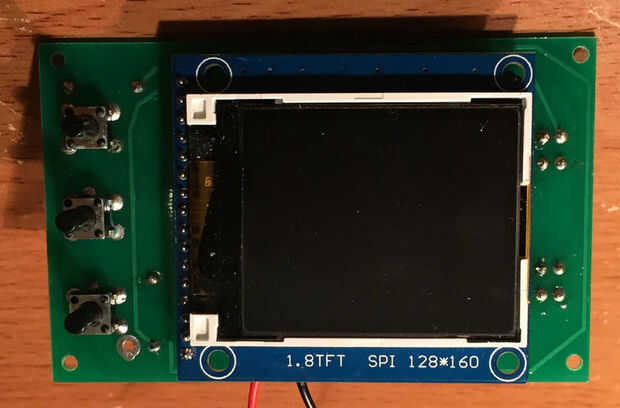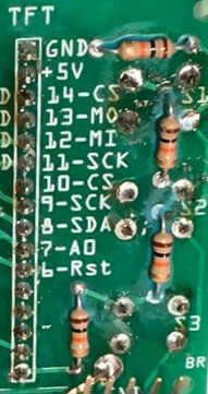 Por último, en el otro lado del tablero de la pantalla LCD y los botones, hay lugares donde se deben montar resistencias de cuatro 10 k. Más sobre esto más adelante pero estas resistencias crean un divisor tres patas del voltaje, que junto con los pulsadores, una entrada en el Nano para tres botones.