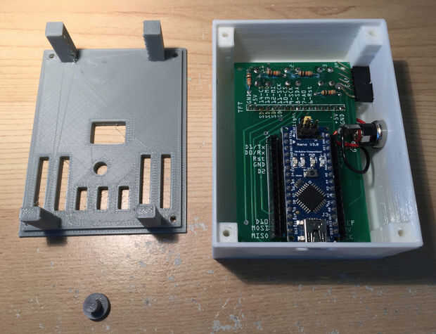 El reverso de la caja ahora puede fijarse mediante los cuatro tornillos (14). Los postes en la parte posterior de la caja (12) deben presionar firmemente el PCB contra el frente de la caja. La extensión del botón de reset (15) se puede utilizar para hacer más fácil restablecer el Nano aunque esto tiene la desventaja de hacer un restablecimiento accidental posible