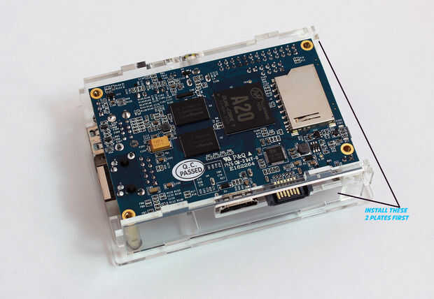 Ahora que la junta esté correctamente alineada con la placa superior inicio construcción del marco, marco largo Instale los dos pedazos en primer lugar, con la bahía HDMI y la placa trasera con el conector de vídeo compuesto y audio. Recuerde que si no cabe es revés o boca abajo gire la pieza hasta que encaje perfectamente sin ninguna fuerza.