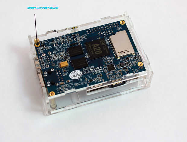 Ahora, inserte las dos piezas del marco corto, uno con la bahía USB y el otro con los dos botones micro, tarjeta SD y conector de USB OTG bahías. Ahora puede comenzar a sujetan la placa con el corto 4 hex postes de tornillos.