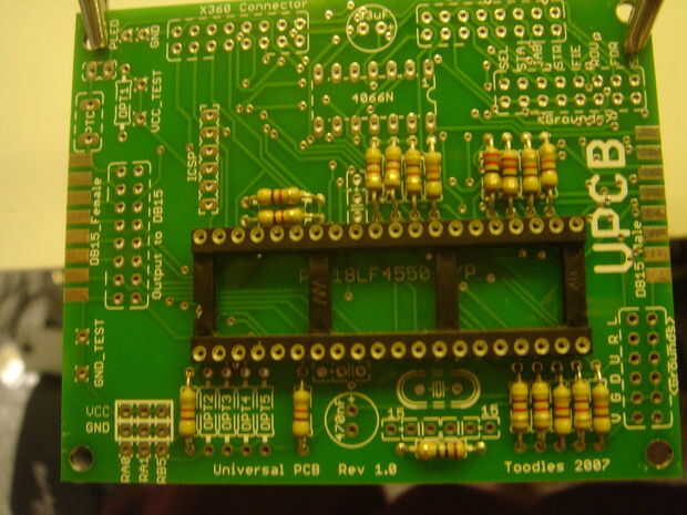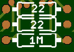 Los dos etiquetados '22' requieren una resistencia de 22 ohmios. Utilizando los mismos pasos como el Levante los resistores, doblar la resistencia, insértelo a través de los orificios por lo que la resistencia se pone plana contra el tablero, doblar las piernas para asegurar en su lugar, soldadura y corte las piernas extras.