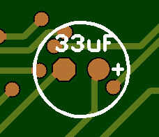 Condensador electrolítico está marcado '33uF' en el condensador y la serigrafía. Colocar en los agujeros marcados con '33uF' entre el X360 y conectador de la C.C. en el lado opuesto del tablero. Doble comprobación que el pin marcado negativo en el condensador no está en el conjunto marcado con un signo más en el tablero. Establecidas correctamente, doblar las patas para fijarla, soldadura y corte cualquier exceso de alambre.