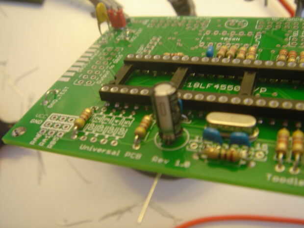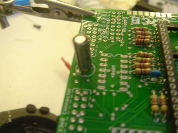 Las piernas son más bien juntos en el condensador, significando no ponga todo el camino, pero será aproximadamente de 1mm por encima de la Junta. Esto es normal. No lo fuerce.