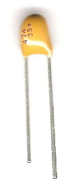 Comience con el condensador marcado .47uF. Para aquellos que conocen su sistema métrico, debe saber que.47 uF es igual a 470nF. Si tienes un capacitor de tantalio, verás las marcas de '474'. Lugar en los agujeros marcado con '470nF' al lado del cristal, doble comprobación que el pin negativo no está en el agujero marcado con un signo más en el tablero. Establecidas correctamente, doblar las patas para fijarla, soldadura y corte cualquier exceso de alambre.