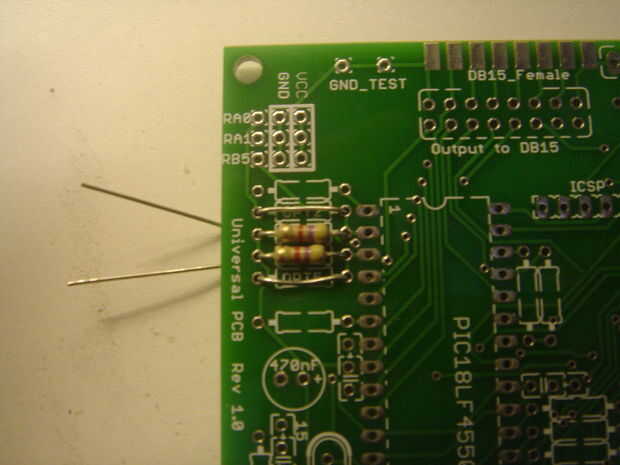 Los dos botones adicionales utilizará las líneas RA0 y RA1. Sólo les ató a alto con un tirón para arriba del resistor, y usted tendrá que conectarse a las líneas RA0 y RA1 en la esquina de la UPCB dos botones extras. Las otras patas de los botones deben conectar a tierra; Usted puede usar las clavijas de tierra justo al lado de los puntos de RA0 y RA1, pero estas son sólo una conveniencia. Se hará ninguna conexión de tierra.