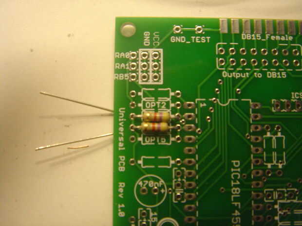 A continuación, necesitamos puente la resistencia puntos marcados OPT2 y OPT5. No necesitamos ningún tipo de resistencia aquí, necesitamos conectarlos junto con los pedazos de alambre extra cortado previamente. Doblar el alambre para insertar en los orificios en el lugar de OPT2. Inserte y descansar como plana contra el tablero como sea posible, asegurándose de que no toque ningún otro componente. Doblar las piernas para asegurar en su lugar y de la soldadura. Recorte cualquier cable adicional. Repetir con un pedazo de alambre en el punto marcado OPT5.