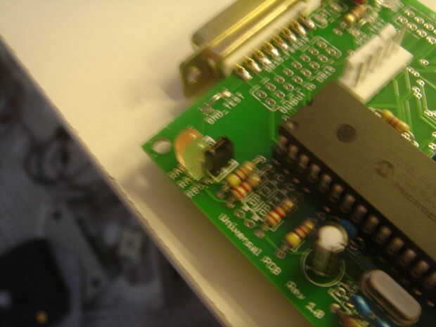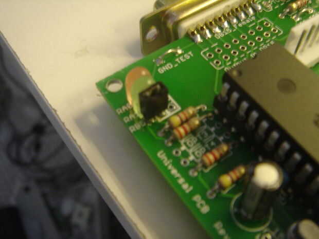 En las siguientes imágenes, verás cómo lo hice en mi convertidor de NeoGeo opción pcb. He utilizado un par de patillas de la cabecera; uno soldado el agujero RB5 y el otro en el agujero de tierra vecino. Si uso el puente para conectarlos, es el mismo como si hubiera pulsado un presionado un botón. Si no están conectados, lo mismo es como si yo no estaba presionando el botón.