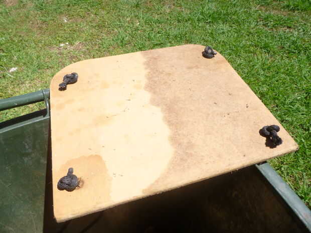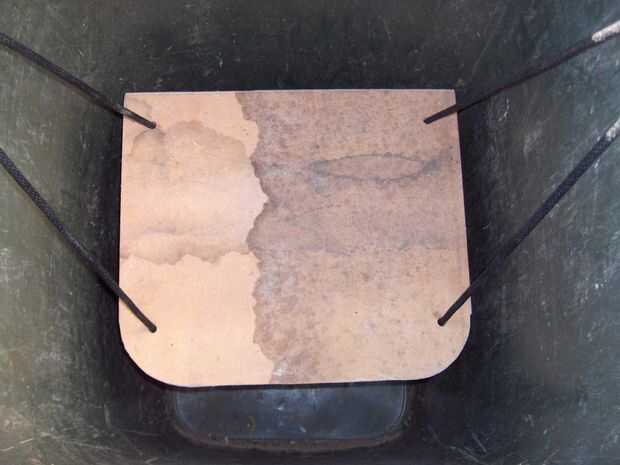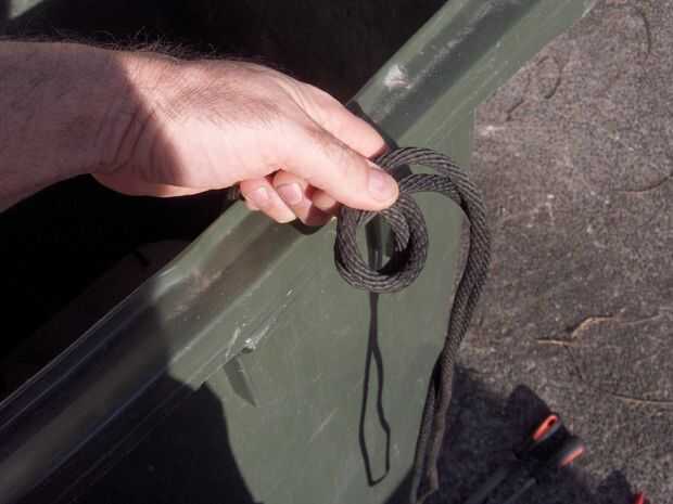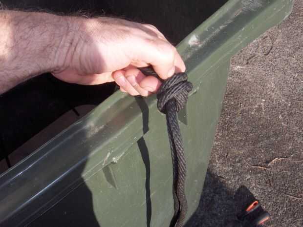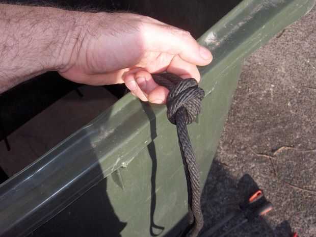 Coloque la planta dentro de la papelera, luego tire de una de las cuerdas hasta que el piso está a poca distancia de la persona menor que recoge la leña. Mantenga la cuerda de modo que el dedo índice en la parte superior de la muesca. Un nudo del pulgar con la otra mano - no mover la posición de su dedo índice! - y facilitar el nudo más apretado sin hacerlo avanzar más allá de su dedo índice. Hacer lo mismo en el otro lado para que la Junta es nivel dentro de la papelera. Puede que necesite ajustar uno de los nudos. Si usted necesita cambiar la altura de la Junta más adelante, es lo suficientemente simple como soltar, mover y volver a apretar los nudos.