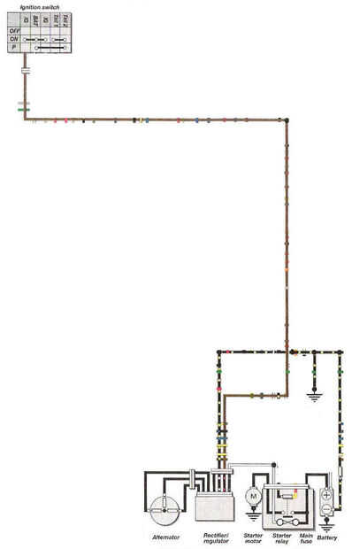 Ahora concentrarse en los restantes dos o tres cables que salen del regulador rectificador. La tierra del alambre en este caso es blanco sobre negro. El hilo se une al fusible principal y es de color azul negro. El cable restante es el vivo. Es y es de color rojo sobre negro.