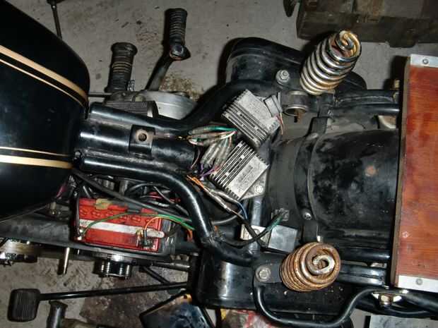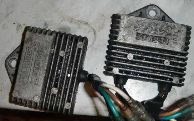 Así que desmontar el sillín y echar un vistazo para dos cuadros de plata con aletas de refrigeración en Unidas por un tramo corto de alambre. Provechoso que tienen las palabras "Regulador" y "Rectificador" respectivamente en relieve sobre ellos.