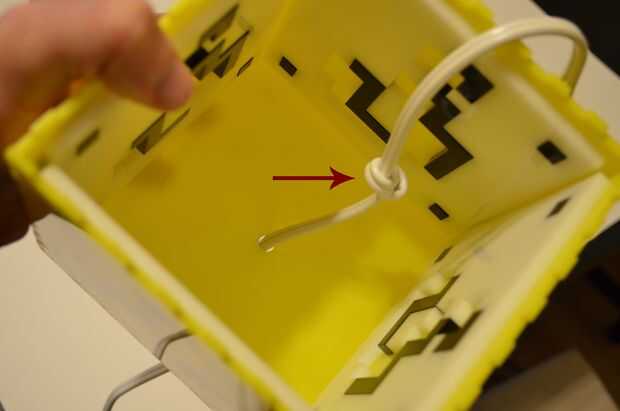 Ahora, antes de que podemos soldar los cables en las clavijas de nuestro suministro de energía, necesitamos enhebrar el cordón por el agujero en la parte superior de la caja. Coloque el extremo cortado a través del agujero y tire a través de un buen 1-2 pies, luego un nudo en ese extremo. La lámpara se va a colgar contra este nudo, por lo que usar algo que va a permanecer en el lugar. Soy parcial al nudo de tope Figura 8. Puede encontrar instrucciones para atar este nudo en toda la web.