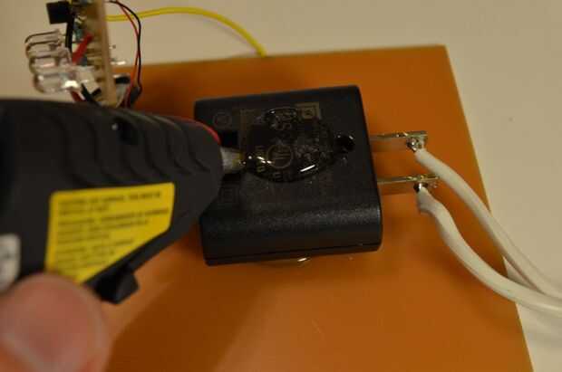 Después de que el pegamento se establece, el siguiente paso es pegar la placa de circuito en la parte superior de la fuente de alimentación. Porque la parte inferior de la placa de circuito es todo accidentada con todos los puntos de soldadura que usted hizo, no va a querer quedar completamente plano. Está bien, sin embargo, sólo un montón de pegamento caliente se aplica a la parte superior de la fuente de alimentación, luego aplastar el tablero del circuito en, asegurándose de que los LEDs están apuntando hacia arriba. Tendrás que mantener el circuito en su lugar durante unos segundos mientras el pegamento caliente se enfría.