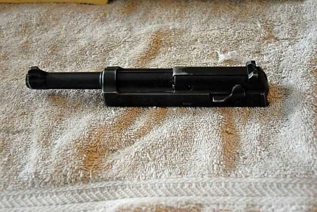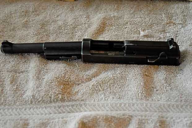 Para integrarlo todo, encaja el Asamblea de barril de la diapositiva; Ponga la parte posterior de la Asamblea de barril en la parte delantera de la corredera, para subir el bloque de fijación por lo que se ajusta. Fotos 1 y 2 muestran este paso.