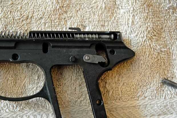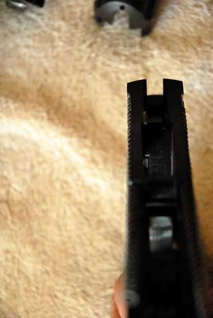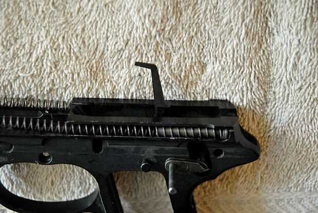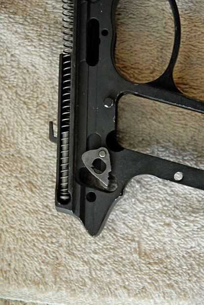 Foto 2 muestra el eyector, correctamente orientado para ir en su ranura en el marco (de la tapa).  Aviso la ranura en la parte delantera de eyección, aquí es donde el pasador para dorar se ajuste y sostenga en su lugar.