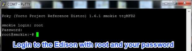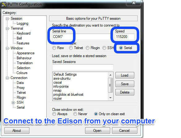Elija la serie tipo, línea en serie COM7 (según lo visto anteriormente al configurar su Edison) a velocidad de 115200. Haga clic en abrir