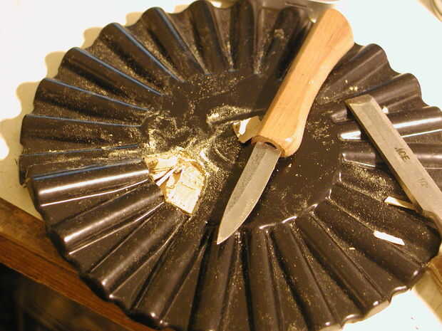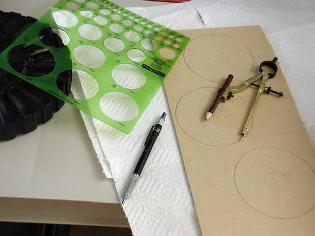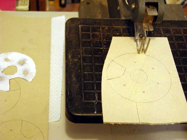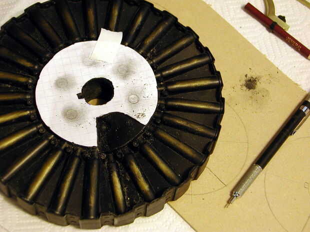 Resultó que tengo más cercano tanto en apariencia y en deseado dimensiones si agregué un disco extra de 1/8" MDF en la parte inferior. Afortunadamente tuve una réplica de la espuma-cast y a tomar medidas de. Para obtener la ubicación de los agujeros de medio decorativos, he triturado un poco plomo de HB de un lápiz mecánico e hizo un roce con mi dedo para transferir la información a una hoja de papel.