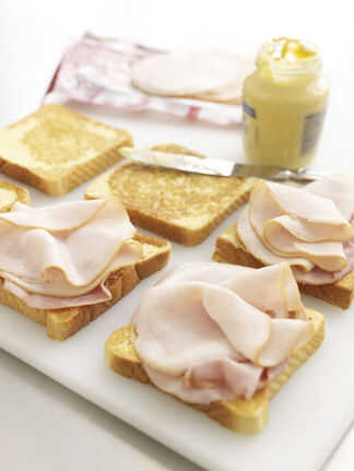 Caliente el horno a 400 grados f el. extender la mostaza en 6 pedazos de la torrija y dividir el jamón y pavo uniformemente entre las 6 piezas.