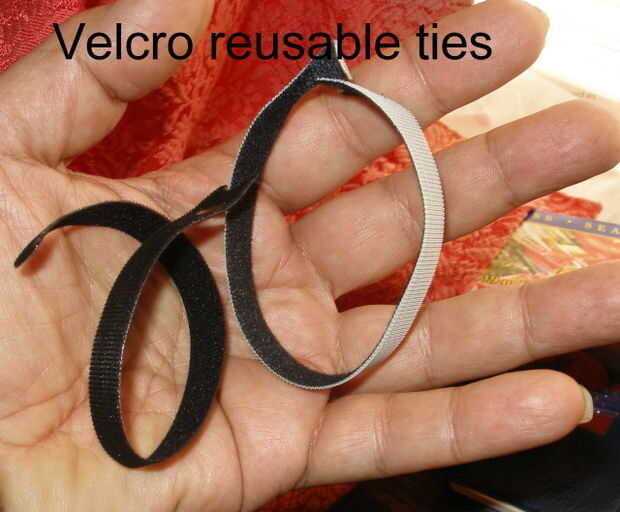 Un tamaño se corta en tiras de 8" largo de 1/2" de ancho, con un extremo acampanado más ancha con una ranura que acepta el otro extremo y diseñado para envolver cables y alambres. Está disponible en tiendas de suministros de oficina, entre otros lugares. El embalaje fue marcado "correas de Velcro marca: lazos reutilizables" y viene en un pack de 50 por $4.99, 20822371 parte en OfficeMax, por ejemplo. Dos de estas piezas se utilizan apretado un poco el molde contra el cuerpo de la cámara y contrapresión para resistir la tendencia del cable a sí mismo empuje lejos el botón del obturador.