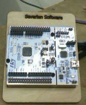 ST Micro ha presentado recientemente una serie de consejos de desarrollo pequeños, de bajo costo. Tienen headers hembra establecidos como el Arduino y clavijas macho adicionales para otras señales. El hombre fija exdend por encima y por debajo de la Junta. Esto es menos directo para reutilizar una de mis placas de montaje repuestas de Arduino. Usé pedazos de desecho de madera y unos tornillos para hacer algo para conseguir comenzó.