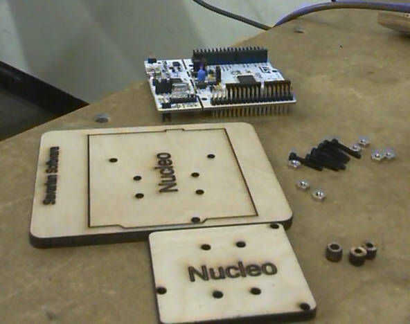 4. 3 arandelas gruesas. Cortarlos de la misma madera que utilicé para el diseño principal. El agujero de centro es aproximadamente.12 pulgadas y el diámetro externo es aproximadamente.2 pulgadas. Usted puede hacer un poco más gruesa, pero que tenga un problema de separación con una de las arandelas y los encabezados de pin en el Nucleo.