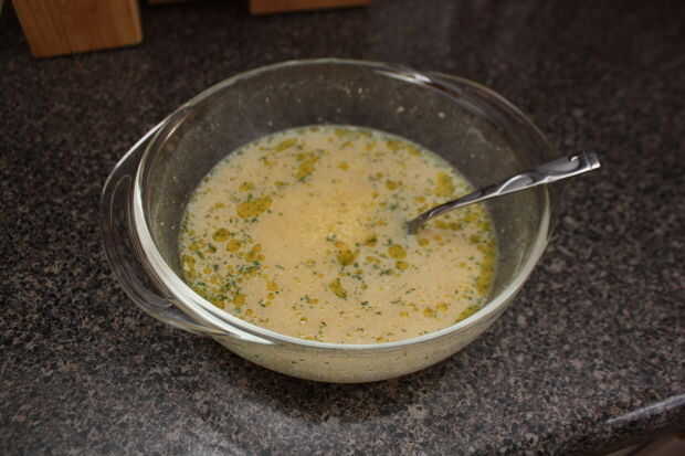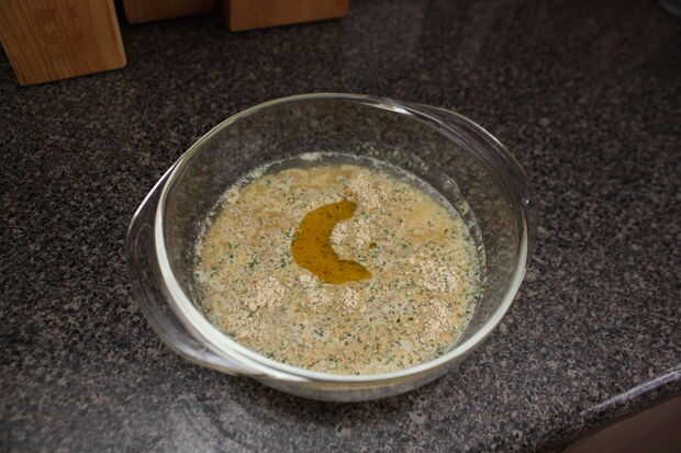 En un tazón grande combine la pasta Couscous, 1 1/4 tazas de agua, sabor paquete y 2 cucharaditas de aceite de oliva.