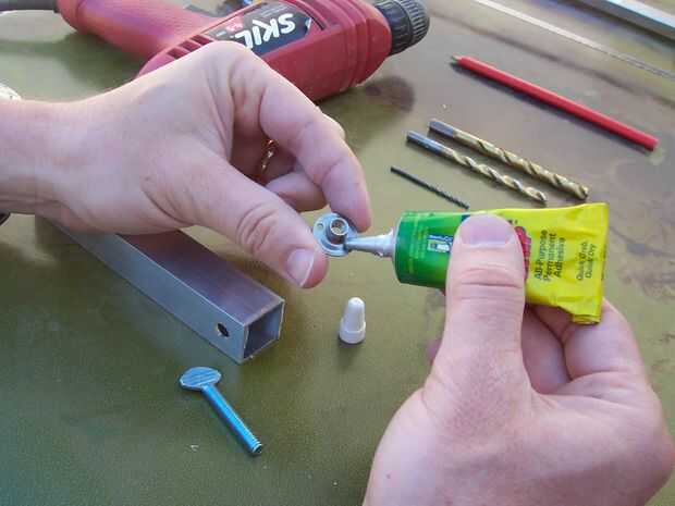 Con los adhesivos de metal, pegamento de la t tuerca dentro del tubo, proyectando a través del agujero de 5/16. El pegamento no es una conexión estructural, es sólo para mantener la tuerca de caer hacia fuera cuando no esté en uso. Si es necesario, puede contener la t tuerca en su lugar mientras el pegamento está secando enroscando uno de los tornillos de pulgar en él.