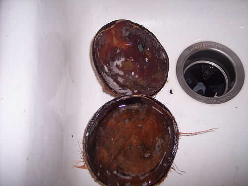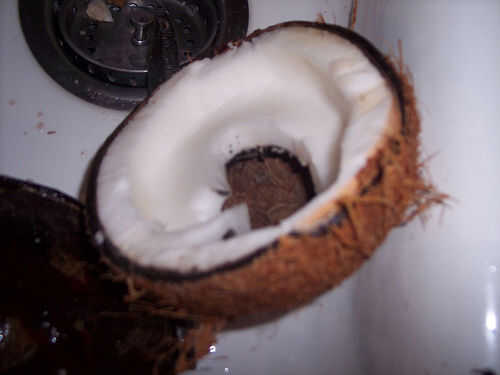 Si usted pl una a comer coco, aclaración hacia fuera debajo del fregadero, luego con un cuchillo, Corte la carne de coco blanco. Asegúrese de que todos los de la carne se ha eliminado.