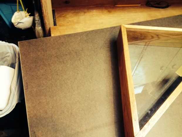Después de trazar el contorno de la caja en Masonite, córtelo con aproximadamente 1/16 de pulgada quitado.  Luego use el 1/16 de pulgada broca para perforar seis orificios para el respaldo.  Utilice los tornillos de madera de 1/2 pulgadas para fijar el Masonite a la parte posterior de la caja.