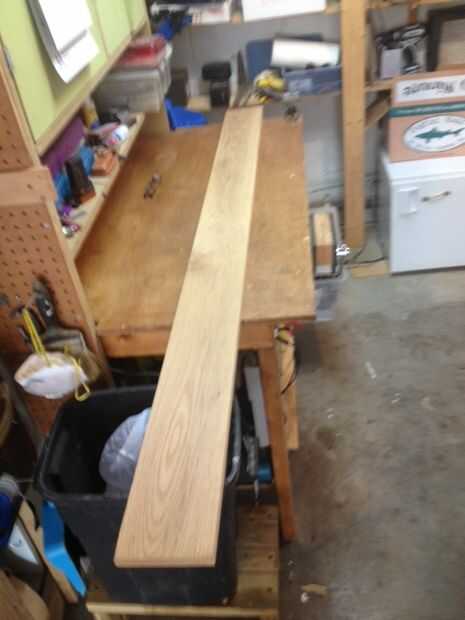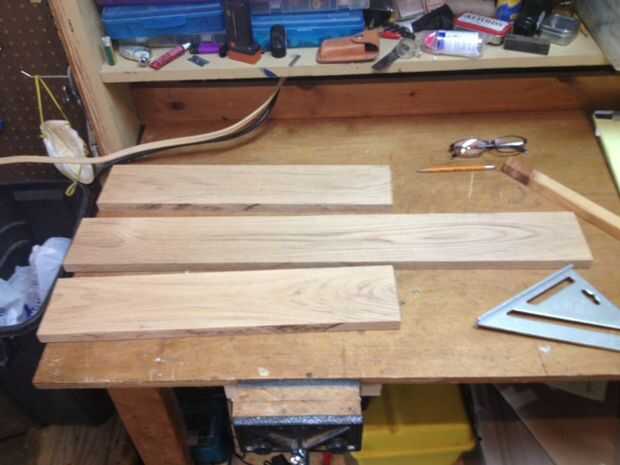 Primero tienes que extraer la madera para que sea la anchura correcta.  Mis casos son 4 3/8 pulgadas de profundidad.  En segundo lugar usted necesita cortar las tres piezas.  Empiezo con los postes que son cerca de 1 pulgada de largo lo que necesito y una base que es aproximadamente 1/2 pulgada más de lo necesario.  Así que para mi caso de los montantes eran 18 7/8 pulgadas de largo y la Base 26 3/4 pulgadas de largo.  Nota que ambas piezas vertical son trapezoides.  La medición es el borde largo.