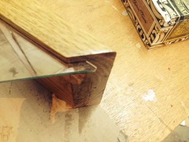 Poner la pieza base, otra vez, asegurándose de que la ranura del cristal está en el lugar correcto. El vidrio se debe extender aproximadamente 1/4 de pulgada como se puede ver en mi foto. Cuando se pone la base en vidrio debe asentarse en la ranura. Luego perfore agujeros en la base que extiende en ambos postes en a 45 grados ángulo y unidad de tornillos de 1 pulgada en. Asegúrese de no atornillar a los montantes. Es posible que un wee pedazo de base sobresale. Basta con ejecutar que en pequeños pasos a través de una mesa vio en un trineo hasta que quede al ras. Desenroscar todo. Retire con cuidado el vidrio. Ahora lije todo. Me gusta "romper el borde de los montantes para darle un poco más de un aspecto acabado. También he usado un router para redondear un poco pero me gusta el aspecto de arenado.