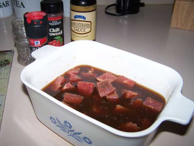 pizca de Chile en polvo, sal y pimienta. Agregar la carne al adobo y refrigere durante al menos dos horas. He preparado el adobo antes de acostarse y dejar la carne macerar toda la noche.