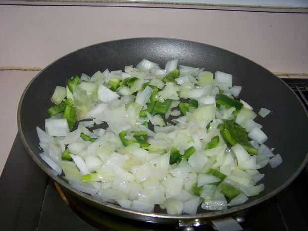 Saltear la cebolla, el ajo y el pimiento verde en aceite, comenzando con 1/2 cucharada y agregar más si es necesario. Rehogar durante unos cinco minutos, revolviendo constantemente. Añadir a vasija olla.