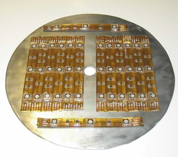Corte la tira de LED en las marcas de la tijera. Las tiras de LED tienen cinta adhesiva en la parte posterior. Hasta que el disco está casi totalmente cubierto con cinta adhesiva las tiras de LED en el disco de acero.