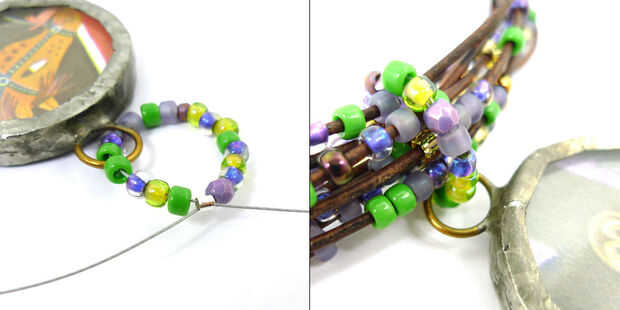 Cadena de una sección de 6 pulgadas de alambre de abalorios con cuentas de 6-0 y grano un prensado 16-20. Este hilo a través del lazo en la parte superior del colgante Mood Swing. Colocar los extremos del alambre por el crimp, como, para crear un bucle. Compruebe para asegurarse de que este lazo se ajusta alrededor de la sección de cuero del collar y ajustar según sea necesario quitando o agregando granos. Aplane la encrespadura firmemente con alicates de cadena. Forma colgante en collar.