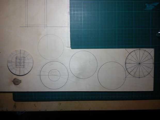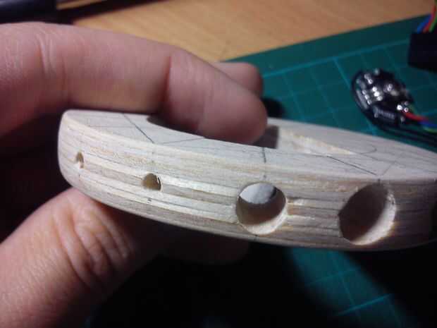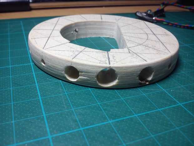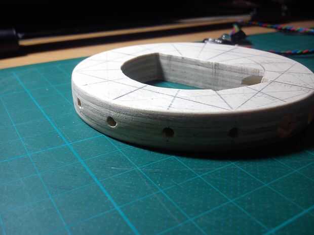 Collar se hizo de los tres círculos de 4mm que se pegan. Por supuesto usted puede cortar un círculo de 12mm de madera contrachapada. No hace ninguna diferencia. Cómo puedes ver, está marcado un círculo con dieciséis líneas. Esas líneas me ayudaron a mantener iguales distancias entre los agujeros. También tuve que cortar el centro del collar a abandonar el lugar de los cables.