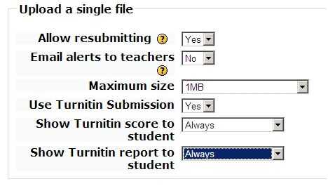 Mostrar puntuación Turnitin estudiante: es generalmente útil para los estudiantes ver su puntuación de turnitin inmediatamente. Esto ayuda a los estudiantes a aprender de sus errores. Generalmente se debe establecer siempre